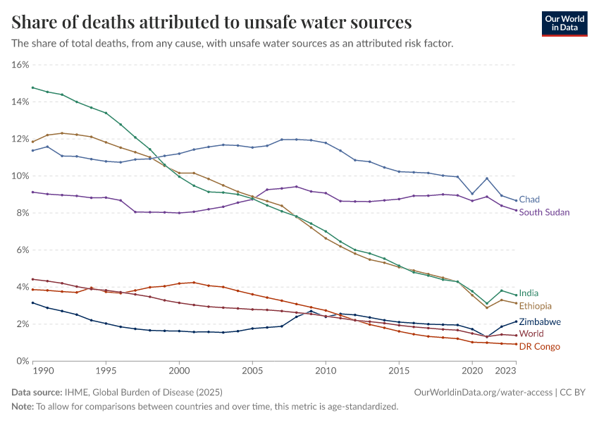 IHME, Global Burden of Disease (2025) – with major processing by Our World in Data. “Share of deaths attributed to unsafe water sources – IHME” [dataset]. IHME, Global Burden of Disease, “Global Burden of Disease - Risk Factors - Deaths” [original data]. Retrieved April 17, 2026 from https://archive.ourworldindata.org/20260319-180137/grapher/share-deaths-unsafe-water.html (archived on March 19, 2026).