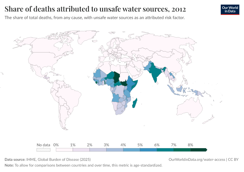IHME, Global Burden of Disease (2025) – with major processing by Our World in Data. “Share of deaths attributed to unsafe water sources – IHME” [dataset]. IHME, Global Burden of Disease, “Global Burden of Disease - Risk Factors - Deaths” [original data]. Retrieved April 4, 2026 from https://archive.ourworldindata.org/20260319-180137/grapher/share-deaths-unsafe-water.html (archived on March 19, 2026).