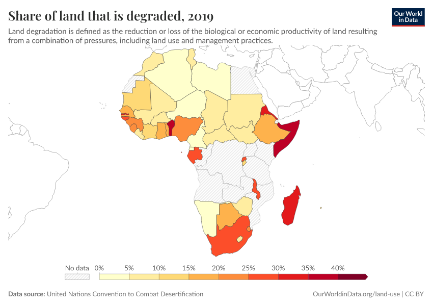 “Data Page: Share of land that is degraded”. Our World in Data (2026). Data adapted from United Nations Convention to Combat Desertification. Retrieved from https://archive.ourworldindata.org/20251125-165536/grapher/share-degraded-land.html [online resource] (archived on November 25, 2025).How to cite this data