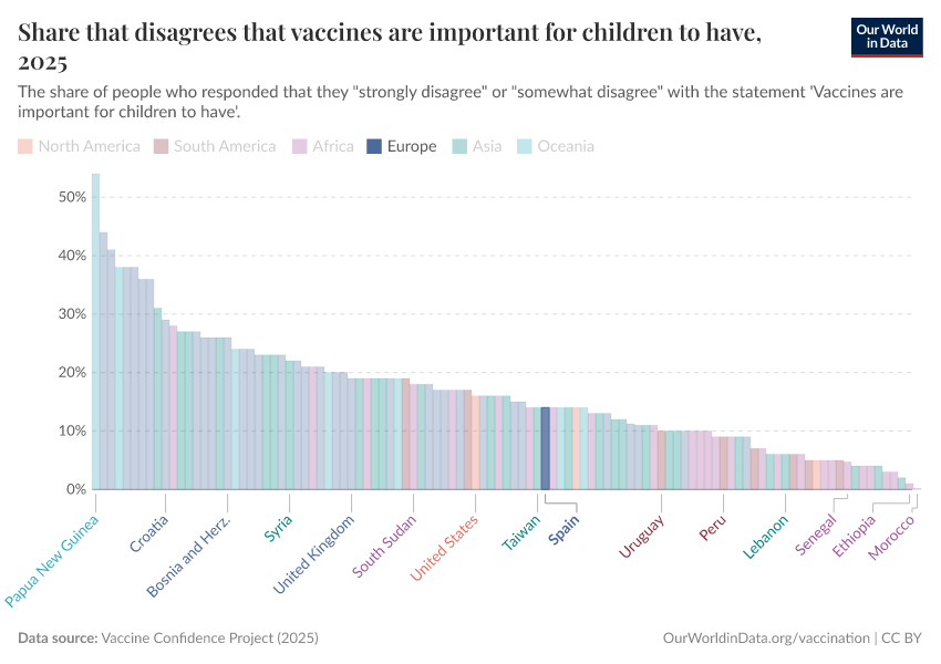 Vaccine Confidence Project (2025) – processed by Our World in Data. “Share that disagrees that vaccines are important for children to have” [dataset]. Vaccine Confidence Project, “Vaccine Confidence Index” [original data]. Retrieved December 24, 2025 from https://archive.ourworldindata.org/20251209-133038/grapher/share-disagrees-vaccines-are-important.html (archived on December 9, 2025).