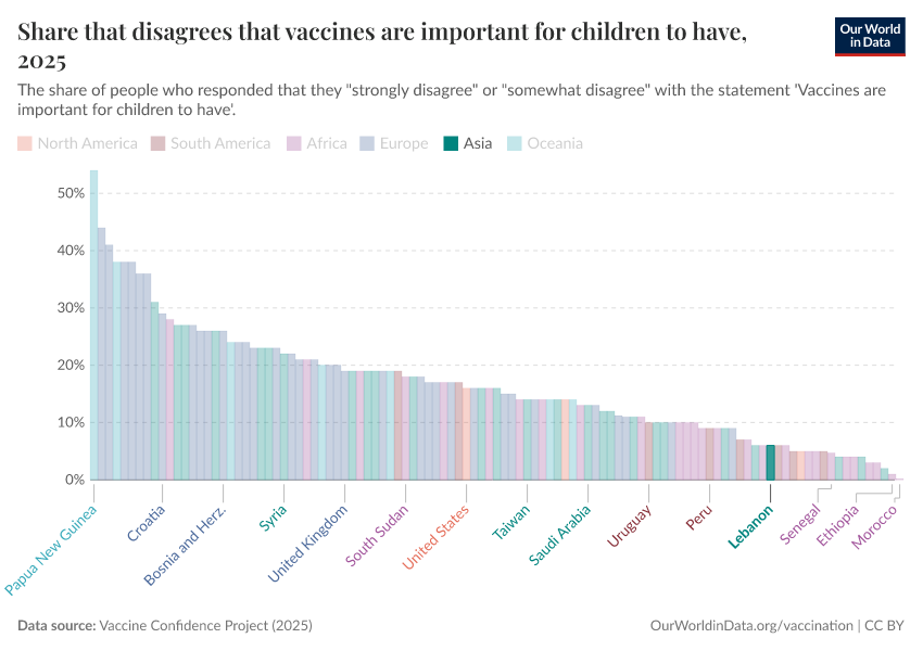 Vaccine Confidence Project (2025) – processed by Our World in Data. “Share that disagrees that vaccines are important for children to have” [dataset]. Vaccine Confidence Project, “Vaccine Confidence Index” [original data]. Retrieved January 7, 2026 from https://archive.ourworldindata.org/20251209-133038/grapher/share-disagrees-vaccines-are-important.html (archived on December 9, 2025).