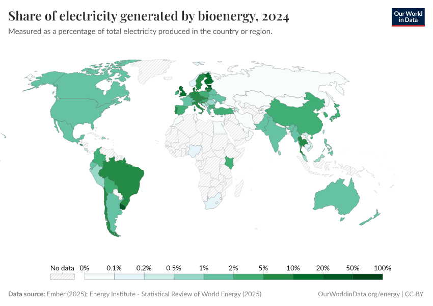 “Data Page: Share of electricity generated by bioenergy”, part of the following publication: Hannah Ritchie, Pablo Rosado, and Max Roser (2023) - “Energy”. Data adapted from Ember, Energy Institute. Retrieved from https://archive.ourworldindata.org/20251212-065051/grapher/share-electricity-bioenergy.html [online resource] (archived on December 12, 2025).How to cite this data