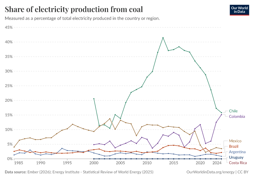 Ember (2026); Energy Institute - Statistical Review of World Energy (2025) – with major processing by Our World in Data. “Share of electricity generated by coal” [dataset]. Ember, “Yearly Electricity Data Europe”; Ember, “Yearly Electricity Data”; Energy Institute, “Statistical Review of World Energy” [original data]. Retrieved January 16, 2026 from https://archive.ourworldindata.org/20260109-144605/grapher/share-electricity-coal.html (archived on January 9, 2026).