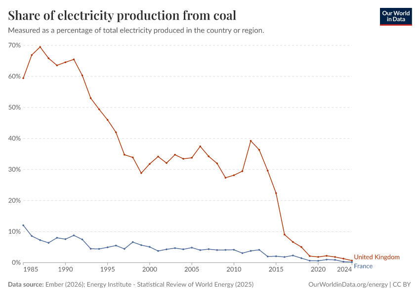 “Data Page: Share of electricity generated by coal”, part of the following publication: Hannah Ritchie, Pablo Rosado, and Max Roser (2023) - “Energy”. Data adapted from Ember, Energy Institute. Retrieved from https://archive.ourworldindata.org/20260109-144605/grapher/share-electricity-coal.html [online resource] (archived on January 9, 2026).How to cite this data