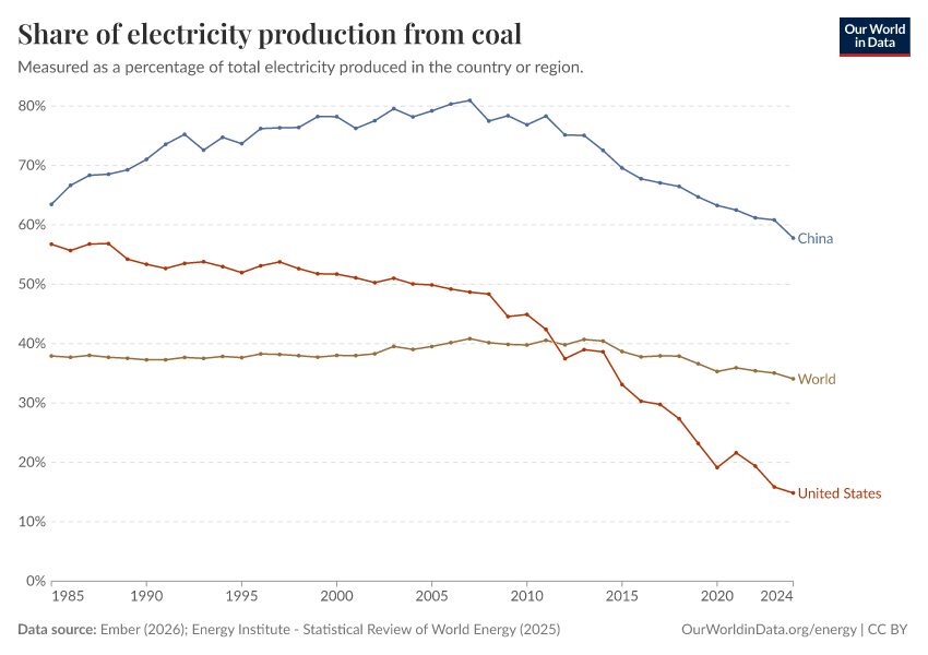 Ember (2026); Energy Institute - Statistical Review of World Energy (2025) – with major processing by Our World in Data. “Share of electricity generated by coal” [dataset]. Ember, “Yearly Electricity Data Europe”; Ember, “Yearly Electricity Data”; Energy Institute, “Statistical Review of World Energy” [original data]. Retrieved January 12, 2026 from https://archive.ourworldindata.org/20260109-144605/grapher/share-electricity-coal.html (archived on January 9, 2026).