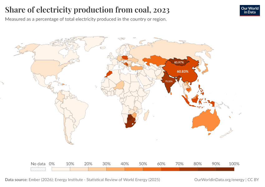 “Data Page: Share of electricity generated by coal”, part of the following publication: Hannah Ritchie, Pablo Rosado, and Max Roser (2023) - “Energy”. Data adapted from Ember, Energy Institute. Retrieved from https://archive.ourworldindata.org/20260203-171503/grapher/share-electricity-coal.html [online resource] (archived on February 3, 2026).How to cite this data