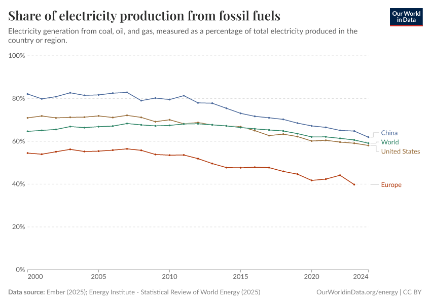 Ember (2025); Energy Institute - Statistical Review of World Energy (2025) – with major processing by Our World in Data. “Share of electricity generated by fossil fuels – Ember” [dataset]. Ember, “Yearly Electricity Data Europe”; Ember, “Yearly Electricity Data”; Energy Institute, “Statistical Review of World Energy” [original data]. Retrieved December 27, 2025 from https://archive.ourworldindata.org/20250909-093708/grapher/share-electricity-fossil-fuels.html (archived on September 9, 2025).