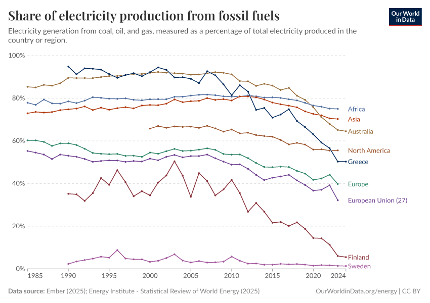Ember (2025); Energy Institute - Statistical Review of World Energy (2025) – with major processing by Our World in Data. “Share of electricity generated by fossil fuels – Ember” [dataset]. Ember, “Yearly Electricity Data Europe”; Ember, “Yearly Electricity Data”; Energy Institute, “Statistical Review of World Energy” [original data]. Retrieved December 7, 2025 from https://archive.ourworldindata.org/20250909-093708/grapher/share-electricity-fossil-fuels.html (archived on September 9, 2025).