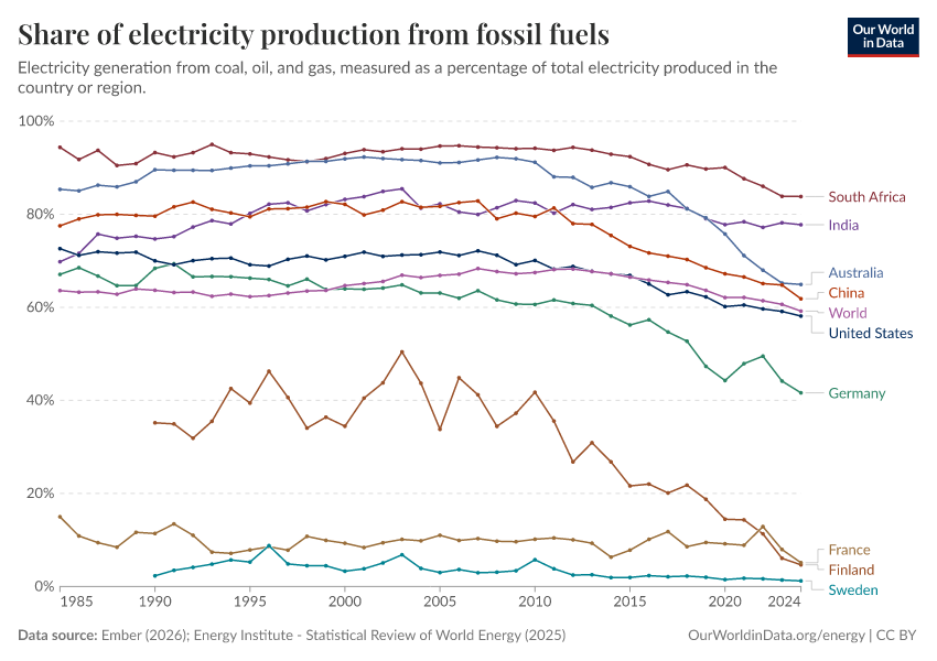 Ember (2026); Energy Institute - Statistical Review of World Energy (2025) – with major processing by Our World in Data. “Share of electricity generated by fossil fuels – Ember” [dataset]. Ember, “Yearly Electricity Data Europe”; Ember, “Yearly Electricity Data”; Energy Institute, “Statistical Review of World Energy” [original data]. Retrieved January 13, 2026 from https://archive.ourworldindata.org/20260109-144605/grapher/share-electricity-fossil-fuels.html (archived on January 9, 2026).