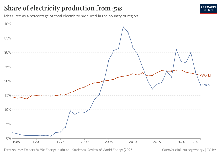 “Data Page: Share of electricity generated by gas”, part of the following publication: Hannah Ritchie, Pablo Rosado, and Max Roser (2023) - “Energy”. Data adapted from Ember, Energy Institute. Retrieved from https://archive.ourworldindata.org/20250909-093708/grapher/share-electricity-gas.html [online resource] (archived on September 9, 2025).