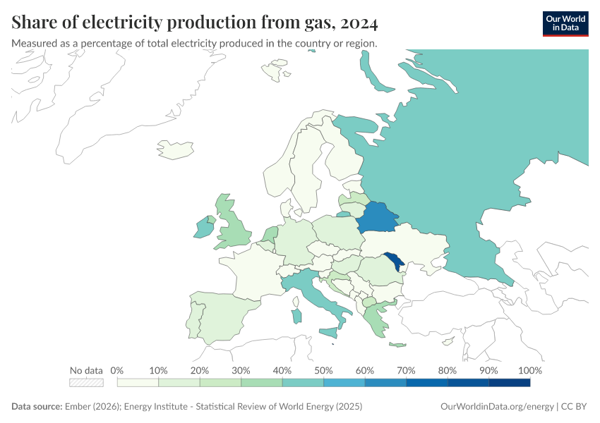 “Data Page: Share of electricity generated by gas”, part of the following publication: Hannah Ritchie, Pablo Rosado, and Max Roser (2023) - “Energy”. Data adapted from Ember, Energy Institute. Retrieved from https://archive.ourworldindata.org/20260109-144605/grapher/share-electricity-gas.html [online resource] (archived on January 9, 2026).How to cite this data