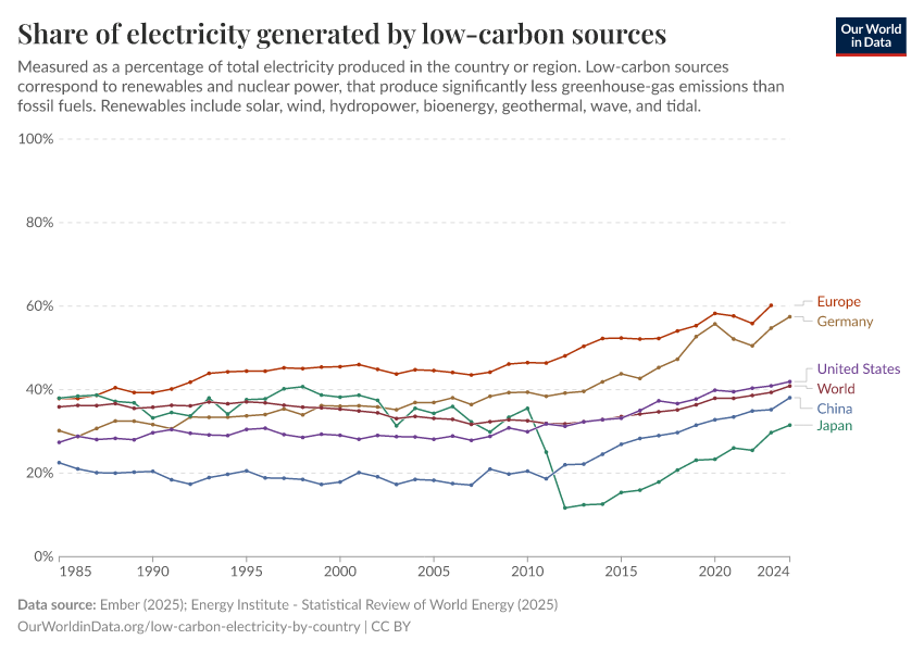 Ember (2025); Energy Institute - Statistical Review of World Energy (2025) – with major processing by Our World in Data. “Share of electricity generated by low-carbon sources” [dataset]. Ember, “Yearly Electricity Data Europe”; Ember, “Yearly Electricity Data”; Energy Institute, “Statistical Review of World Energy” [original data]. Retrieved December 12, 2025 from https://archive.ourworldindata.org/20250909-093708/grapher/share-electricity-low-carbon.html (archived on September 9, 2025).