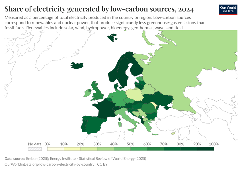Ember (2025); Energy Institute - Statistical Review of World Energy (2025) – with major processing by Our World in Data. “Share of electricity generated by low-carbon sources” [dataset]. Ember, “Yearly Electricity Data Europe”; Ember, “Yearly Electricity Data”; Energy Institute, “Statistical Review of World Energy” [original data]. Retrieved December 30, 2025 from https://archive.ourworldindata.org/20250909-093708/grapher/share-electricity-low-carbon.html (archived on September 9, 2025).