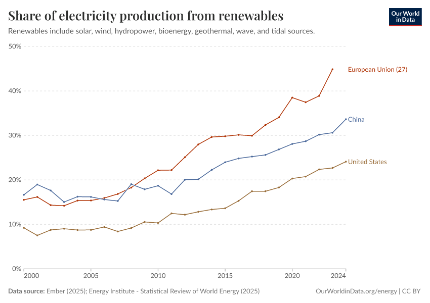 “Data Page: Share of electricity generated by renewables”, part of the following publication: Hannah Ritchie, Pablo Rosado, and Max Roser (2023) - “Energy”. Data adapted from Ember, Energy Institute. Retrieved from https://archive.ourworldindata.org/20250909-093708/grapher/share-electricity-renewables.html [online resource] (archived on September 9, 2025).How to cite this data