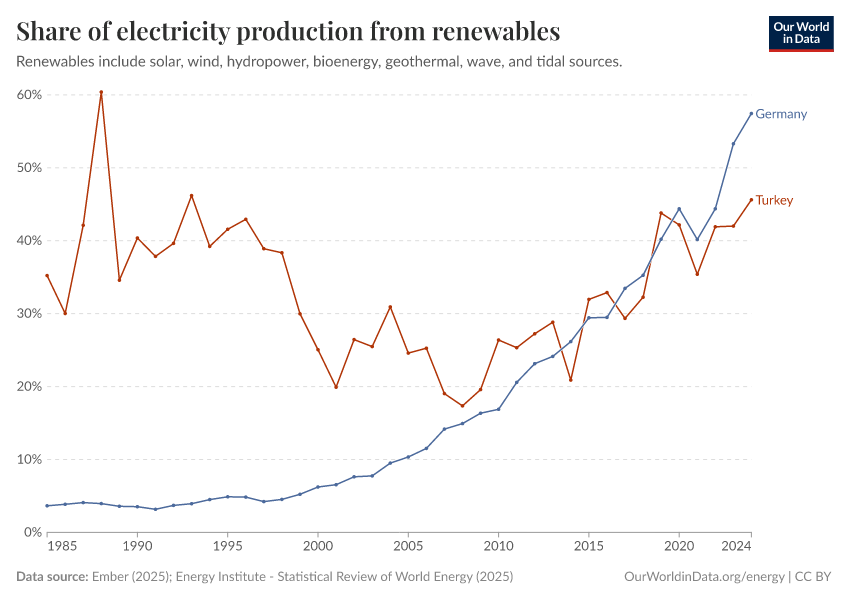 “Data Page: Share of electricity generated by renewables”, part of the following publication: Hannah Ritchie, Pablo Rosado, and Max Roser (2023) - “Energy”. Data adapted from Ember, Energy Institute. Retrieved from https://archive.ourworldindata.org/20250909-093708/grapher/share-electricity-renewables.html [online resource] (archived on September 9, 2025).