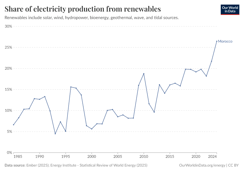 “Data Page: Share of electricity generated by renewables”, part of the following publication: Hannah Ritchie, Pablo Rosado, and Max Roser (2023) - “Energy”. Data adapted from Ember, Energy Institute. Retrieved from https://archive.ourworldindata.org/20250909-093708/grapher/share-electricity-renewables.html [online resource] (archived on September 9, 2025).