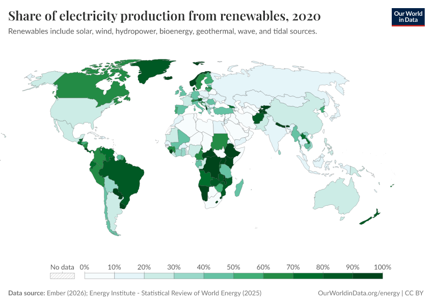 “Data Page: Share of electricity generated by renewables”, part of the following publication: Hannah Ritchie, Pablo Rosado, and Max Roser (2023) - “Energy”. Data adapted from Ember, Energy Institute. Retrieved from https://archive.ourworldindata.org/20260109-144605/grapher/share-electricity-renewables.html [online resource] (archived on January 9, 2026).