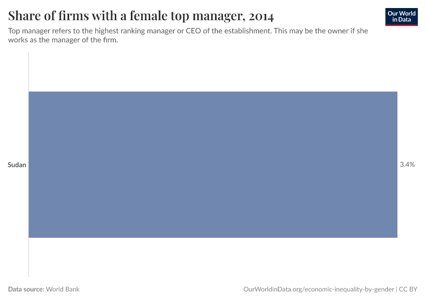 “Data Page: Share of firms with a female top manager”, part of the following publication: Bastian Herre, Veronika Samborska, Pablo Arriagada, and Hannah Ritchie (2023) - “Women’s Rights”. Data adapted from World Bank Gender Statistics. Retrieved from https://archive.ourworldindata.org/20250916-204433/grapher/share-firms-top-female-manager.html [online resource] (archived on September 16, 2025).How to cite this data