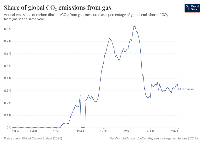 Global Carbon Budget (2025) – with major processing by Our World in Data. “Share of global CO₂ emissions from gas” [dataset]. Global Carbon Project, “Global Carbon Budget v15” [original data]. Retrieved December 5, 2025 from https://archive.ourworldindata.org/20251113-170236/grapher/share-global-co2-gas.html (archived on November 13, 2025).