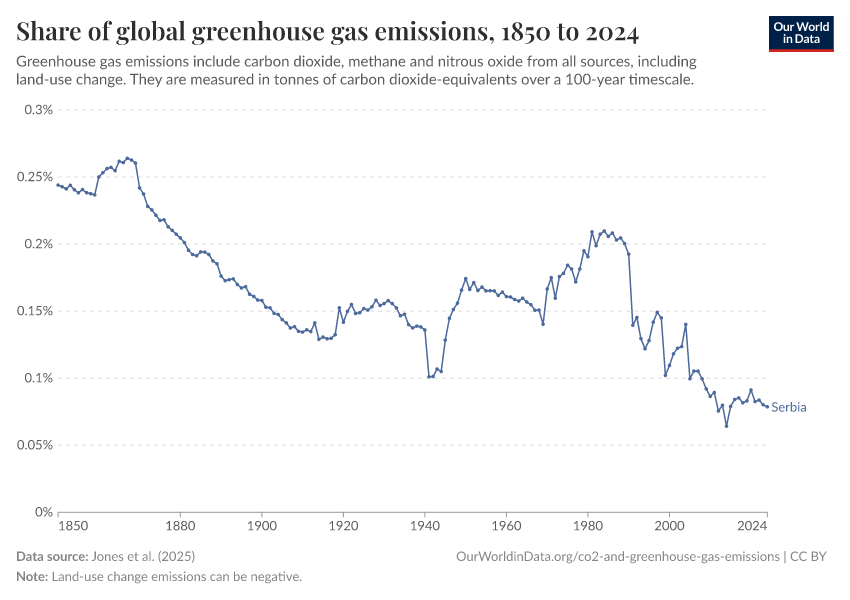 Jones et al. (2025) – with major processing by Our World in Data. “Share of global greenhouse gas emissions” [dataset]. Jones et al., “National contributions to climate change 2025.1” [original data]. Retrieved December 5, 2025 from https://archive.ourworldindata.org/20251204-133820/grapher/share-global-ghg-emissions.html (archived on December 4, 2025).