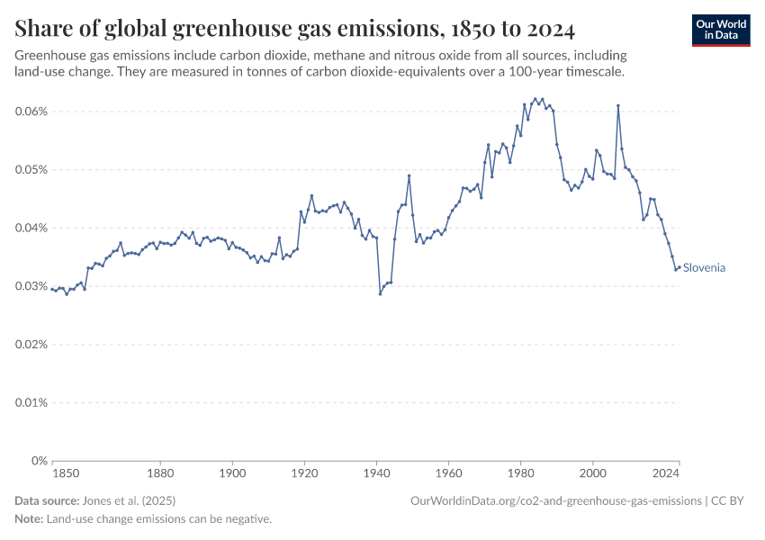 Jones et al. (2025) – with major processing by Our World in Data. “Share of global greenhouse gas emissions” [dataset]. Jones et al., “National contributions to climate change 2025.1” [original data]. Retrieved December 5, 2025 from https://archive.ourworldindata.org/20251204-133820/grapher/share-global-ghg-emissions.html (archived on December 4, 2025).