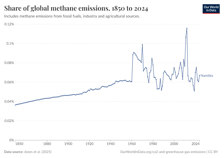 Jones et al. (2025) – with major processing by Our World in Data. “Share of global methane emissions” [dataset]. Jones et al., “National contributions to climate change 2025.1” [original data]. Retrieved December 6, 2025 from https://archive.ourworldindata.org/20251204-133820/grapher/share-global-methane-emissions.html (archived on December 4, 2025).