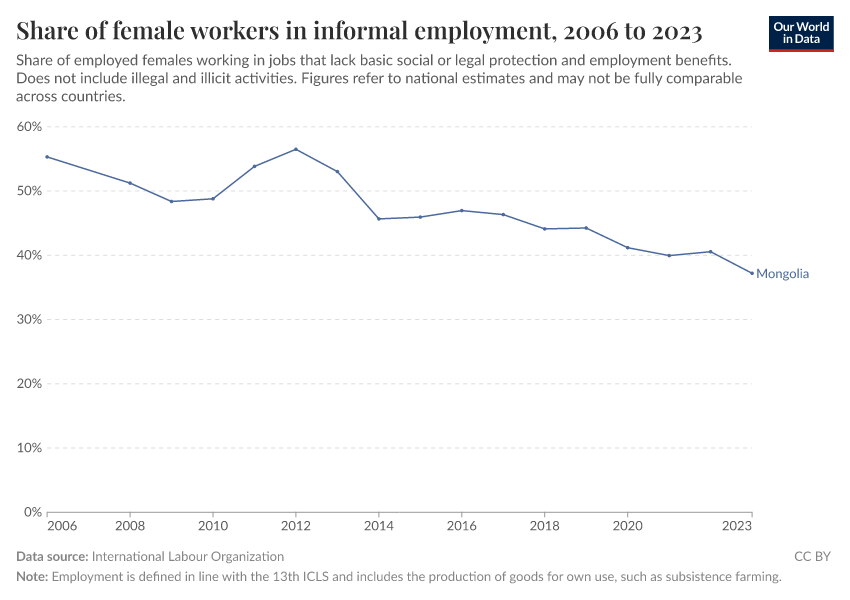 International Labour Organization – with minor processing by Our World in Data. “Share of female workers in informal employment” [dataset]. International Labour Organization, “Data from multiple sources” [original data]. Retrieved December 5, 2025 from https://archive.ourworldindata.org/20251125-165536/grapher/share-in-informal-employment-female.html (archived on November 25, 2025).