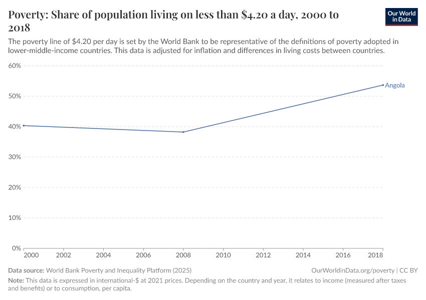 “Data Page: Poverty: Share of population living on less than $4.20 a day”, part of the following publication: Joe Hasell, Bertha Rohenkohl, Pablo Arriagada, Esteban Ortiz-Ospina, and Max Roser (2022) - “Poverty”. Data adapted from World Bank Poverty and Inequality Platform. Retrieved from https://archive.ourworldindata.org/20251030-150046/grapher/share-living-with-less-than-320-int--per-day.html [online resource] (archived on October 30, 2025).