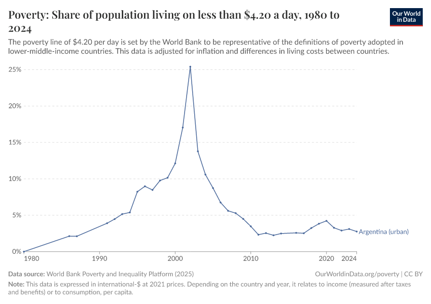 World Bank Poverty and Inequality Platform (2025) – with major processing by Our World in Data. “Poverty: Share of population living on less than $4.20 a day – World Bank” [dataset]. World Bank Poverty and Inequality Platform, “World Bank Poverty and Inequality Platform (PIP) 20250930_2021, 20250930_2017” [original data]. Retrieved January 3, 2026 from https://archive.ourworldindata.org/20251030-150046/grapher/share-living-with-less-than-320-int--per-day.html (archived on October 30, 2025).