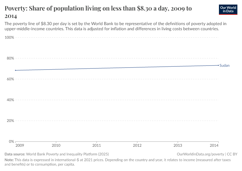 World Bank Poverty and Inequality Platform (2025) – with major processing by Our World in Data. “Poverty: Share of population living on less than $8.30 a day – World Bank” [dataset]. World Bank Poverty and Inequality Platform, “World Bank Poverty and Inequality Platform (PIP) 20250930_2021, 20250930_2017” [original data]. Retrieved December 25, 2025 from https://archive.ourworldindata.org/20251030-150046/grapher/share-living-with-less-than-550-int--per-day.html (archived on October 30, 2025).