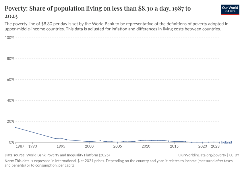 World Bank Poverty and Inequality Platform (2025) – with major processing by Our World in Data. “Poverty: Share of population living on less than $8.30 a day – World Bank” [dataset]. World Bank Poverty and Inequality Platform, “World Bank Poverty and Inequality Platform (PIP) 20250930_2021, 20250930_2017” [original data]. Retrieved January 12, 2026 from https://archive.ourworldindata.org/20260108-112959/grapher/share-living-with-less-than-upper-middle-income-poverty-line.html (archived on January 8, 2026).