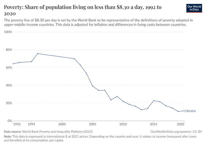 World Bank Poverty and Inequality Platform (2025) – with major processing by Our World in Data. “Poverty: Share of population living on less than $8.30 a day – World Bank” [dataset]. World Bank Poverty and Inequality Platform, “World Bank Poverty and Inequality Platform (PIP) 20250930_2021, 20250930_2017” [original data]. Retrieved January 13, 2026 from https://archive.ourworldindata.org/20260108-112959/grapher/share-living-with-less-than-upper-middle-income-poverty-line.html (archived on January 8, 2026).