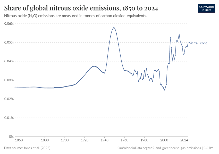 Jones et al. (2025) – with major processing by Our World in Data. “Share of global nitrous oxide emissions” [dataset]. Jones et al., “National contributions to climate change 2025.1” [original data]. Retrieved December 6, 2025 from https://archive.ourworldindata.org/20251204-133820/grapher/share-nitrous-oxide-emissions.html (archived on December 4, 2025).
