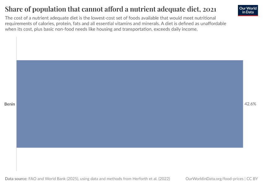 “Data Page: Share of population that cannot afford a nutrient adequate diet”, part of the following publication: Hannah Ritchie, Pablo Rosado, and Max Roser (2023) - “Food Prices”. Data adapted from Herforth et al. (2022), adapted by World Bank. Retrieved from https://archive.ourworldindata.org/20251013-180113/grapher/share-nutritional-diet-unaffordable.html [online resource] (archived on October 13, 2025).