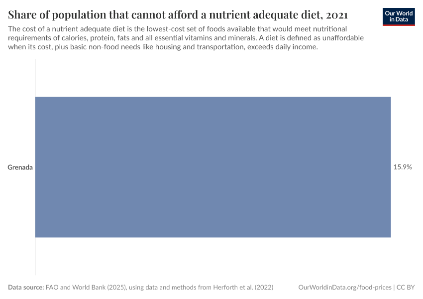 “Data Page: Share of population that cannot afford a nutrient adequate diet”, part of the following publication: Hannah Ritchie, Pablo Rosado, and Max Roser (2023) - “Food Prices”. Data adapted from Herforth et al. (2022), adapted by World Bank. Retrieved from https://archive.ourworldindata.org/20251013-180113/grapher/share-nutritional-diet-unaffordable.html [online resource] (archived on October 13, 2025).How to cite this data