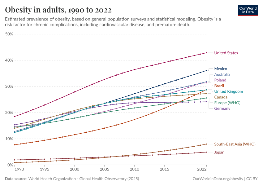 “Data Page: Obesity in adults”. Our World in Data (2025). Data adapted from World Health Organization. Retrieved from https://archive.ourworldindata.org/20250909-093708/grapher/share-of-adults-defined-as-obese.html [online resource] (archived on September 9, 2025).