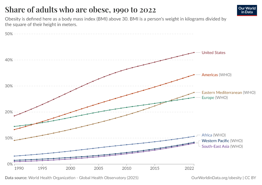 World Health Organization - Global Health Observatory (2025) – processed by Our World in Data. “Share of adults who are obese” [dataset]. World Health Organization, “Global Health Observatory” [original data]. Retrieved April 24, 2026 from https://archive.ourworldindata.org/20260423-123843/grapher/share-of-adults-defined-as-obese.html (archived on April 23, 2026).Download
