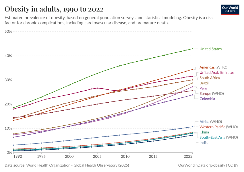 World Health Organization - Global Health Observatory (2025) – processed by Our World in Data. “Obesity in adults” [dataset]. World Health Organization, “Global Health Observatory” [original data]. Retrieved March 27, 2026 from https://archive.ourworldindata.org/20260304-094028/grapher/share-of-adults-defined-as-obese.html (archived on March 4, 2026).