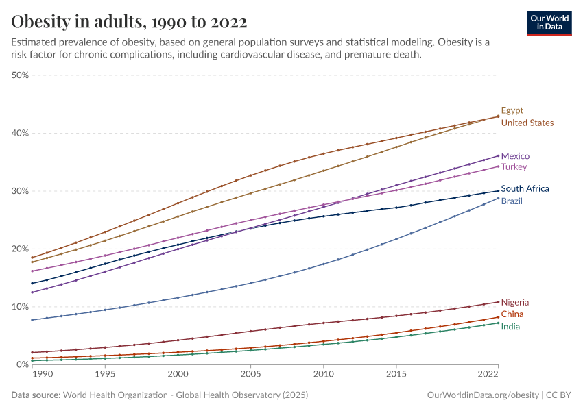 “Data Page: Obesity in adults”. Our World in Data (2025). Data adapted from World Health Organization. Retrieved from https://archive.ourworldindata.org/20250909-093708/grapher/share-of-adults-defined-as-obese.html [online resource] (archived on September 9, 2025).How to cite this data