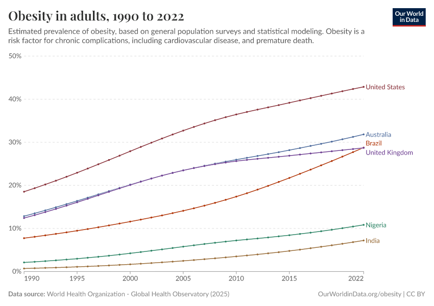 “Data Page: Obesity in adults”. Our World in Data (2025). Data adapted from World Health Organization. Retrieved from https://archive.ourworldindata.org/20250909-093708/grapher/share-of-adults-defined-as-obese.html [online resource] (archived on September 9, 2025).