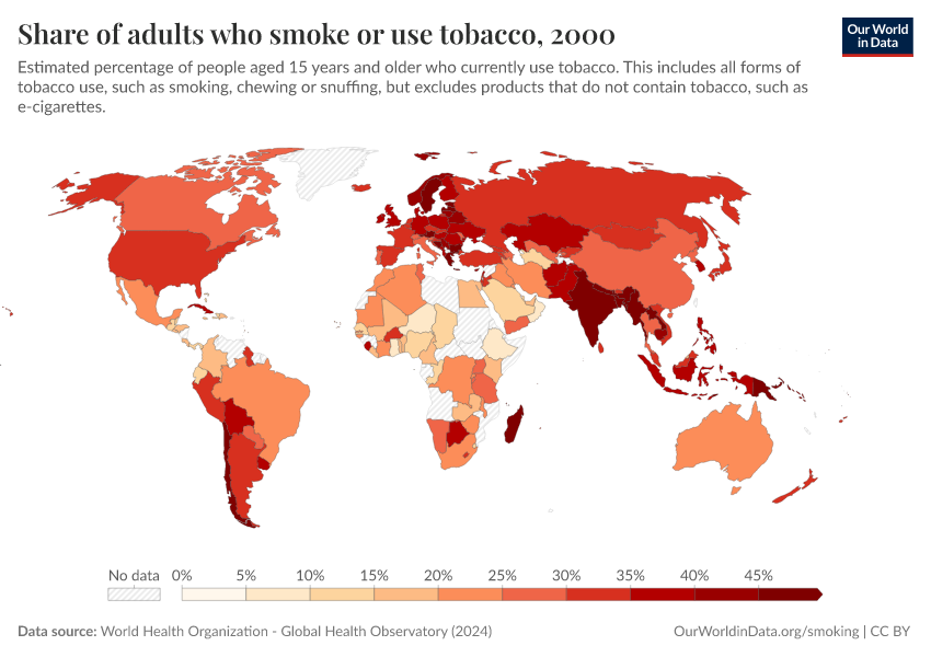 “Data Page: Share of adults who smoke or use tobacco”, part of the following publication: Hannah Ritchie and Max Roser (2023) - “Smoking”. Data adapted from World Health Organization. Retrieved from https://archive.ourworldindata.org/20260406-175604/grapher/share-of-adults-who-smoke.html [online resource] (archived on April 6, 2026).How to cite this data