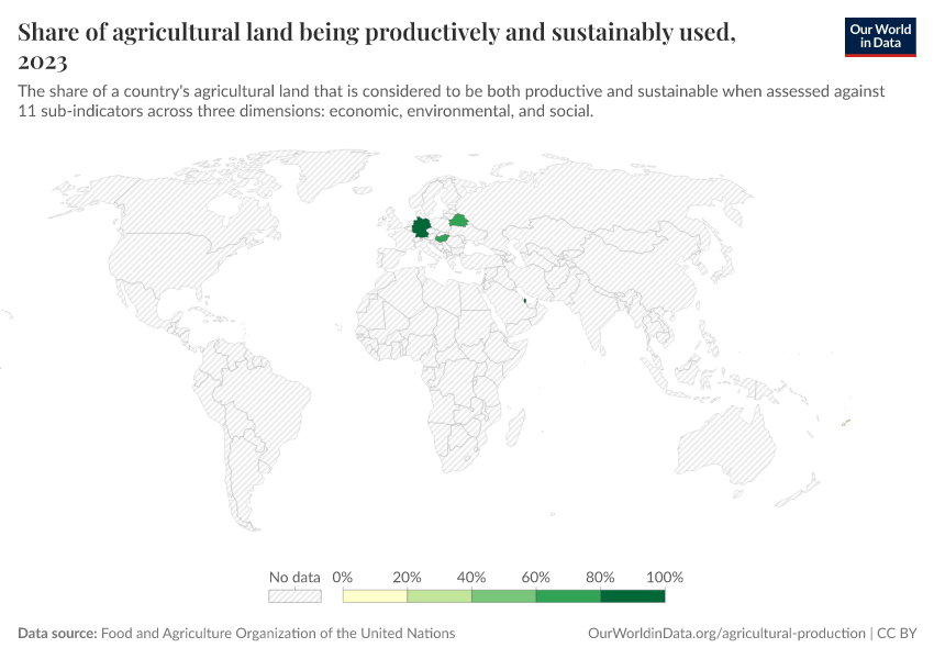 Food and Agriculture Organization of the United Nations – processed by Our World in Data. “Share of agricultural land being productively and sustainably used” [dataset]. Food and Agriculture Organization of the United Nations, “Data from multiple sources” [original data]. Retrieved January 13, 2026 from https://archive.ourworldindata.org/20251120-211749/grapher/share-of-agricultural-land-being-productively-and-sustainably-used.html (archived on November 20, 2025).