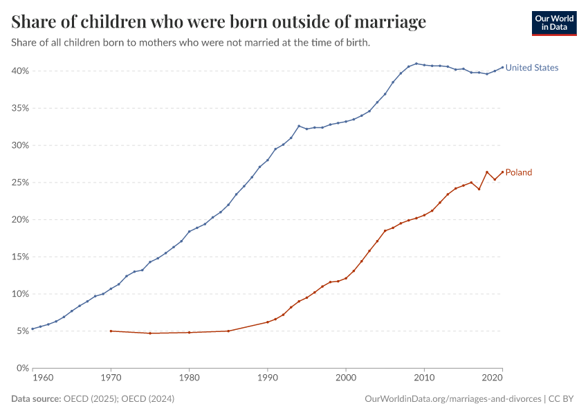 “Data Page: Share of children who were born outside of marriage”, part of the following publication: Bastian Herre, Veronika Samborska, Esteban Ortiz-Ospina, and Max Roser (2020) - “Marriages and Divorces”. Data adapted from OECD. Retrieved from https://archive.ourworldindata.org/20251008-084854/grapher/share-of-births-outside-marriage.html [online resource] (archived on October 8, 2025).How to cite this data
