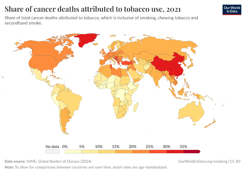“Data Page: Share of cancer deaths attributed to tobacco use”, part of the following publication: Esteban Ortiz-Ospina and Max Roser (2016) - “Global Health”. Data adapted from IHME, Global Burden of Disease. Retrieved from https://archive.ourworldindata.org/20250909-093708/grapher/share-of-cancer-deaths-attributed-to-tobacco.html [online resource] (archived on September 9, 2025).How to cite this data