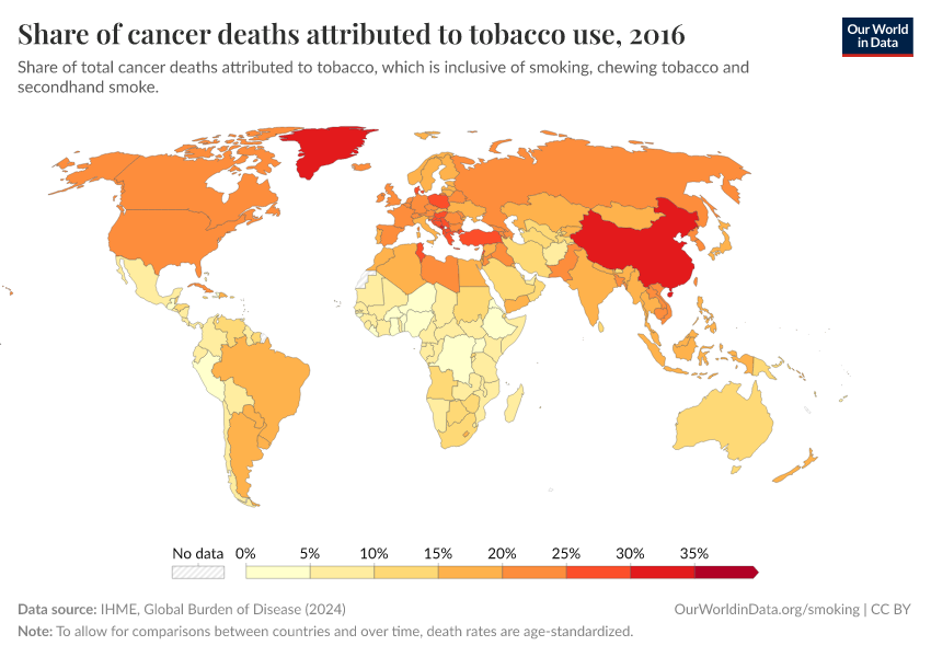 “Data Page: Share of cancer deaths attributed to tobacco use”, part of the following publication: Esteban Ortiz-Ospina and Max Roser (2016) - “Global Health”. Data adapted from IHME, Global Burden of Disease. Retrieved from https://archive.ourworldindata.org/20250909-093708/grapher/share-of-cancer-deaths-attributed-to-tobacco.html [online resource] (archived on September 9, 2025).How to cite this data