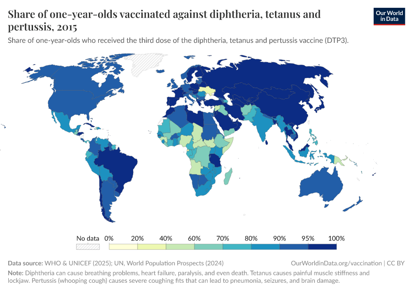 WHO & UNICEF (2025); UN, World Population Prospects (2024) – processed by Our World in Data. “Share of one-year-olds who have had three doses of the diphtheria, tetanus and pertussis vaccine” [dataset]. WHO & UNICEF, “WHO Immunization Data - Vaccination coverage”; United Nations, “World Population Prospects” [original data]. Retrieved December 6, 2025 from https://archive.ourworldindata.org/20250929-104429/grapher/share-of-children-immunized-dtp3.html (archived on September 29, 2025).