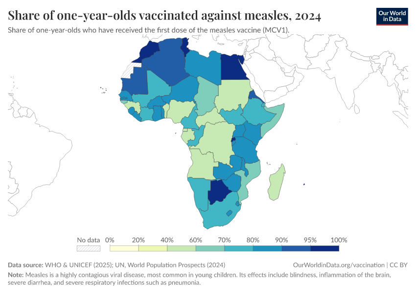 WHO & UNICEF (2025); UN, World Population Prospects (2024) – processed by Our World in Data. “Share of one-year-olds who have had one dose of the measles vaccine” [dataset]. WHO & UNICEF, “WHO Immunization Data - Vaccination coverage”; United Nations, “World Population Prospects” [original data]. Retrieved January 16, 2026 from https://archive.ourworldindata.org/20250929-104429/grapher/share-of-children-vaccinated-against-measles.html (archived on September 29, 2025).