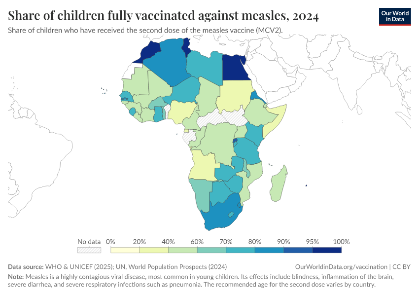 WHO & UNICEF (2025); UN, World Population Prospects (2024) – processed by Our World in Data. “Share of children fully vaccinated against measles” [dataset]. WHO & UNICEF, “WHO Immunization Data - Vaccination coverage”; United Nations, “World Population Prospects” [original data]. Retrieved January 15, 2026 from https://archive.ourworldindata.org/20250929-104429/grapher/share-of-children-vaccinated-with-mcv2.html (archived on September 29, 2025).