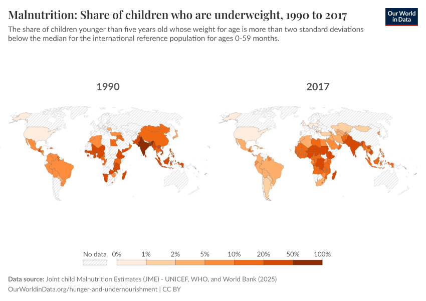 “Data Page: Malnutrition: Share of children who are underweight”. Our World in Data (2026). Data adapted from Joint child Malnutrition Estimates (JME) - UNICEF, WHO, and World Bank. Retrieved from https://archive.ourworldindata.org/20260112-111535/grapher/share-of-children-underweight.html [online resource] (archived on January 12, 2026).