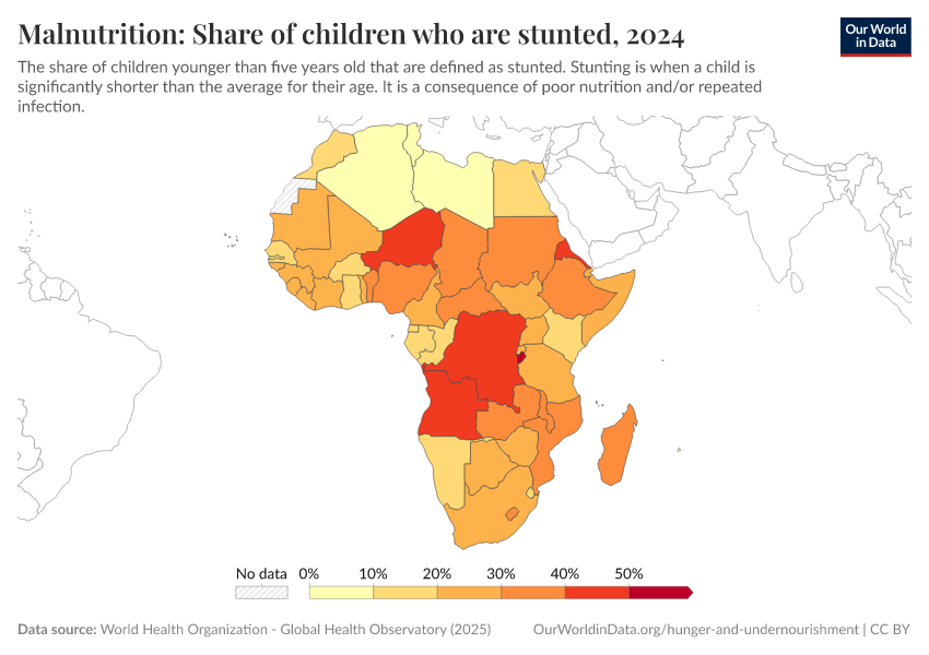 “Data Page: Malnutrition: Share of children who are stunted”. Our World in Data (2025). Data adapted from World Health Organization. Retrieved from https://archive.ourworldindata.org/20250909-093708/grapher/share-of-children-younger-than-5-who-suffer-from-stunting.html [online resource] (archived on September 9, 2025).How to cite this data